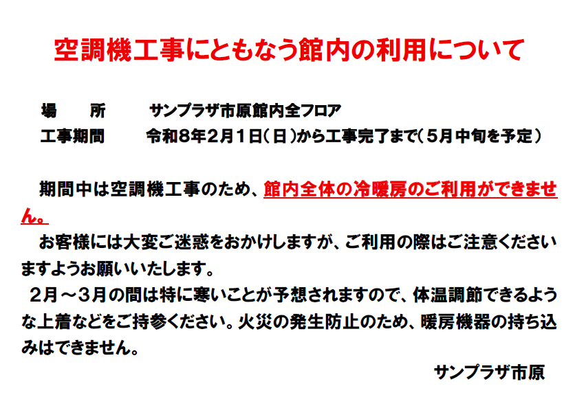 令和8年2月1日(日)から工事完了(5月中旬予定)の期間中、空調機工事のため、館内全フロアの冷暖房のご利用ができません。
